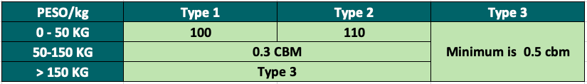 | Cargo types | < 10kg | 10-<50kg | 50-<500kg | >500kg | PRODUCT REQUIREMENTS |